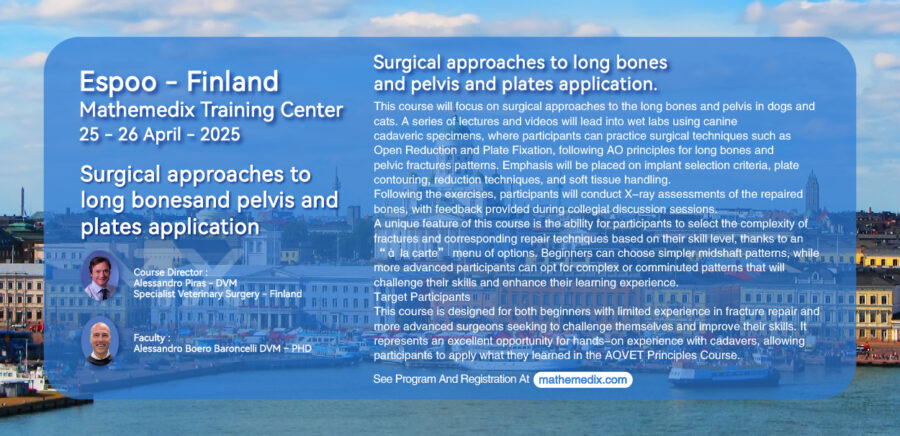 This course will focus on surgical approaches to the long bones and pelvis in dogs and cats. A series of lectures and videos will lead into wet labs using canine cadaveric specimens, where participants can practice surgical techniques such as Open Reduction and Plate Fixation, following AO principles for long bones and pelvic fractures patterns. Emphasis will be placed on implant selection criteria, plate contouring, reduction techniques, and soft tissue handling.